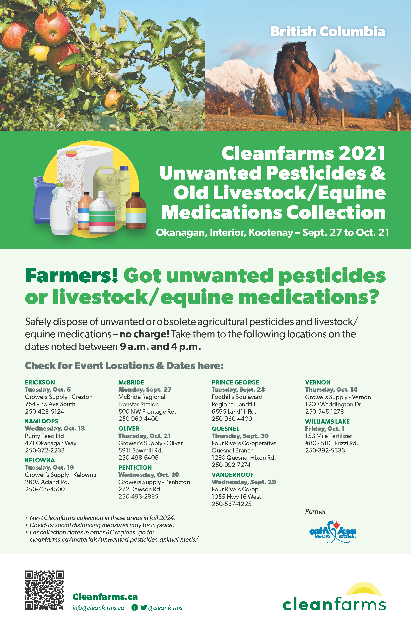 In British Columbia, the Cleanfarms program will cover the Okanagan, Interior, and Kootenay regions from Sept 27 – Oct 21, 2021. See more information on dates and locations here.